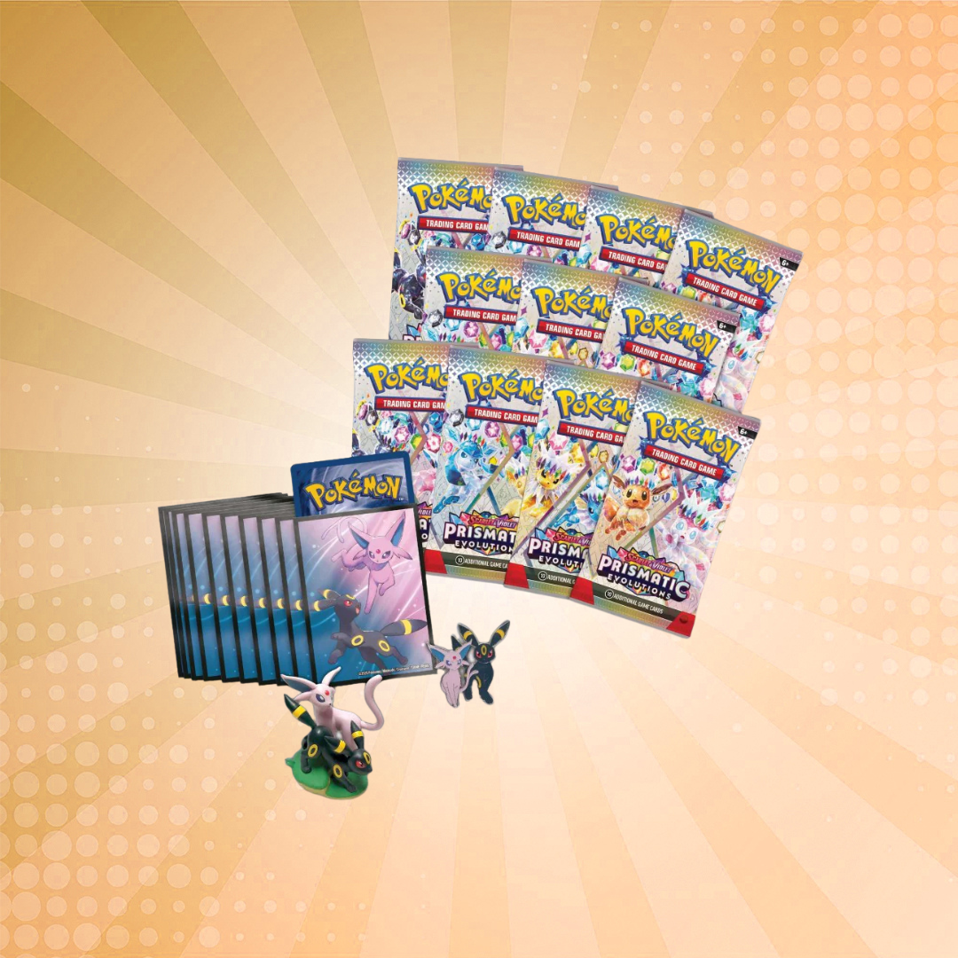 The Sun Pokémon and Moonlight Pokémon combine powers to bring dazzling treasures to your collection! Appearing as Stellar Tera Pokémon ex, Espeon and Umbreon sparkle brightly with attacks that disrupt your opponent’s strategy. These etched foil promo cards are joined by a display-ready figure showing both of these Eevee Evolutions looking focused and fierce, plus a collectible enamel pin and full set of card sleeves for your next deck. Then, get ready to find even more surprises inside booster packs from the special Scarlet & Violet—Prismatic Evolutions expansion!